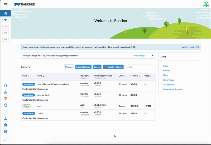 Under the hood, when users deploy a virtual cluster via the UI extension, we’re deploying the regular vCluster Helm chart and the controller will automatically detect any virtual cluster (whether deployed via the UI, Helm, or otherwise) and connect them as clusters in Rancher, so users can manage these virtual clusters just like they would manage any other cluster in Rancher.